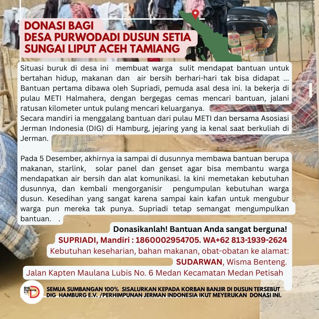 Supriadi, dikenal dengan sebutan Adi, seorang bumi putra wilayah ini menyerukan seruan bantuan yang didengar oleh lembaga persahabatan Jerman Indonesia bernama DIG Hamburg. Kebetulan Supriadi pernah tinggal di kota ini saat dia kuliah. Maka dimulailah pendampingan yang masih bersifat jejaring organisasi dan individual.